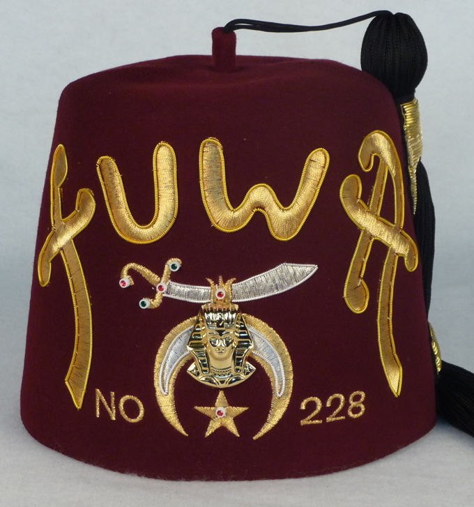 Deluxe double Mylar fez with your temple name. Double gold metallic embroidered fez has large gold metallic thread letters outlined in gold color jaceron wire. This fez comes with a 24" tassel and bullion tassel holders. The top tassel holder is a crescent and the bottom is a bar. The fez body is 100% red wool felt with a ventilated top. The price also includes the temple number and emblem.