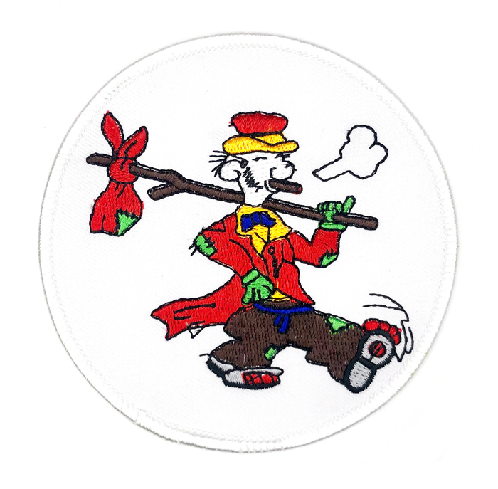 This emblem has a white background with a hobo clown in the center. It is fully embroidered with an iron-on back. The emblem measures 4" in diameter.
