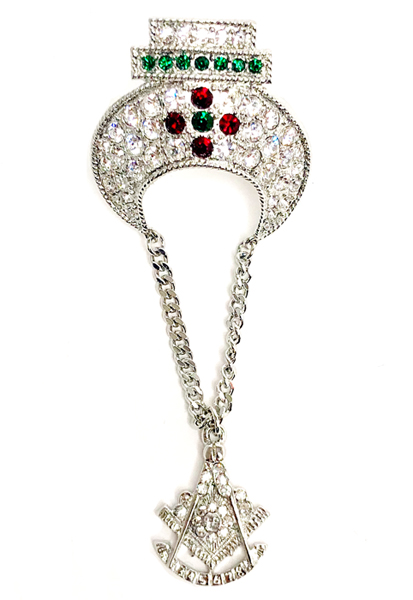 Past Master crescent tassel holder. This silver-tone tassel holder has a crescent with clear, red, and green rhinestones. The Past Master emblem is hanging down from the crescent. There are two clutch back pins to securely hold the tassel holder to the fez.