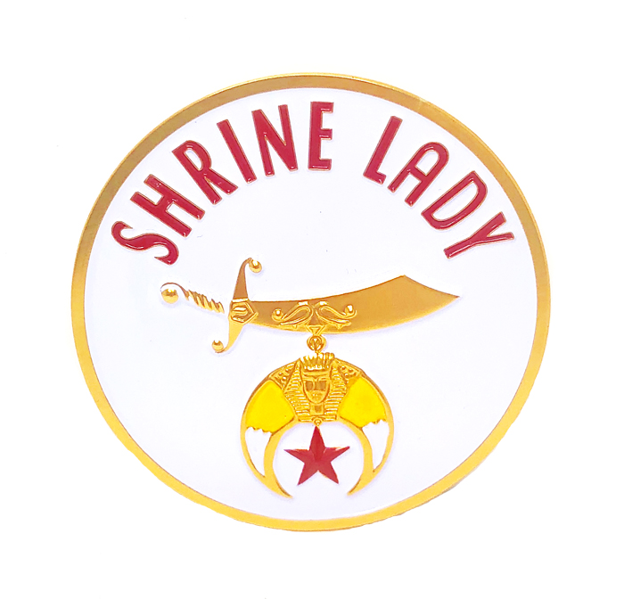 This Shrine Lady car emblem has a white background with the wording, Shrine Lady, across the top in red. The Shrine emblem is yellow, white, and gold-tone with a red star. The car emblem is made out of long lasting aluminum and has a self adhesive backing. It measures 3 inches.