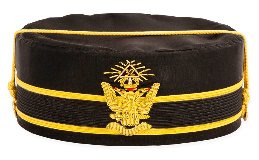 The 32nd degree cap is black with a black band trimmed in gold. In the center front is a double-headed eagle emblem with wings up and a triangle above. The triangle is black and trimmed in gold, it has 32° in its center. Across the top of the cap is gold cord.