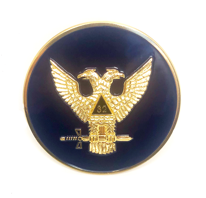 Scottish Rite Northe Jurisdiction 32nd degree wings up car emblem. This car emblem has a black background with the 32nd degree wings up emblem in the center. The car emblem is made out of long lasting aluminum and has a self adhesive backing. It measures 3 inches.