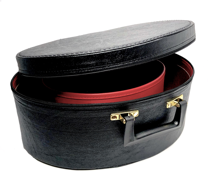 Perfert box for your topper hat. The box is black with a red interior. There is a cone inside to help keep the shape of your topper. The box is 13.5" by 11" and 6" in hieght.
