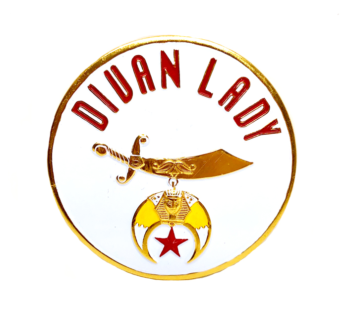 The Divan Lady car emblem has a white background with the wording, Divan Lady, across the top in red. The Shrine emblem is yellow, white, and gold-tone with a red star. The car emblem is made out of long lasting aluminum and has a self adhesive backing. It measures 3 inches.