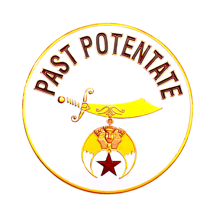 Shrine Past Potentate car emblem. This car emblem has a white background with Past Potentate over the Shrine emblem. The car emblem is made out of long lasting aluminum and has a self adhesive backing. It measures 3 inches.