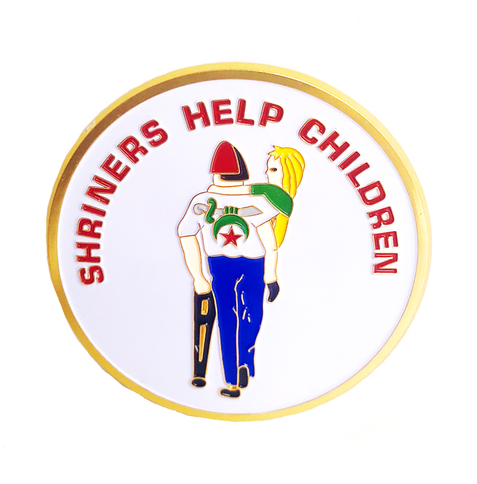 This Shriners help children car emblem has a white background with the wording, Shriners Help Children, across the top in red. The car emblem is made out of long lasting aluminum and has a self adhesive backing. It measures 3 inches.
