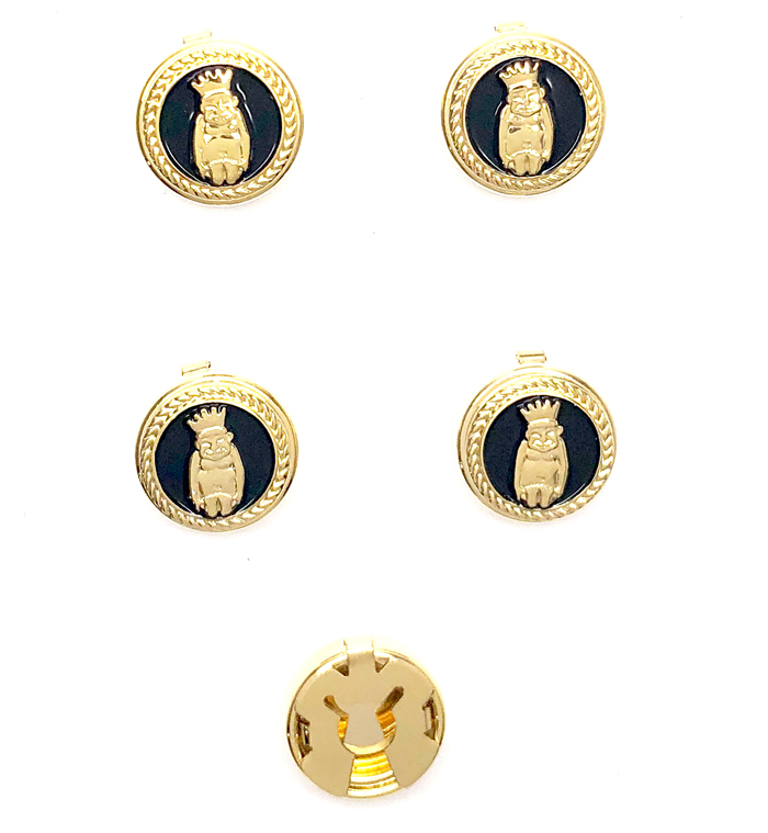 Jester gold-tone button covers come in a set of 5. They have a gold-tone border and black enamel in the center. In front of the black background is the Jester emblem.