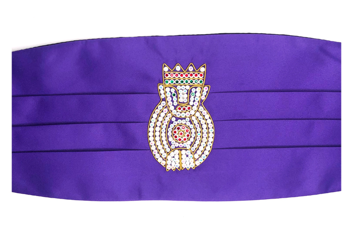 Jester Cummberbund. This cummberbund is purple with the Jester emblem in the center. The emblem is made of plastic back rhinstones in clear, red, and green.