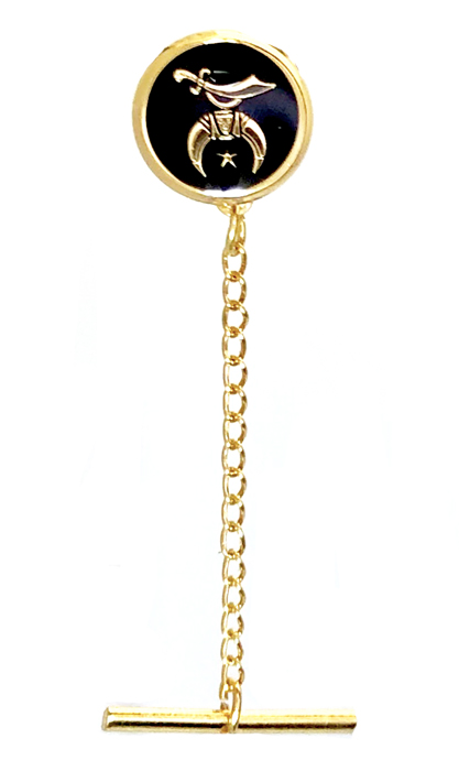 The tie-tack is gold-tone with a black background. In front of the black background is a gold-tone Shrine emblem.