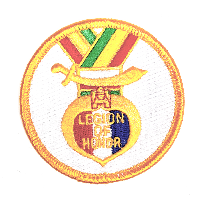 Legion of Honor round iron-on emblem. This emblem has the Legion of Honor logo in the center with a white background, and a gold border. The emblem is fully embroidered with an iron-on back. It measures 3" in diameter.