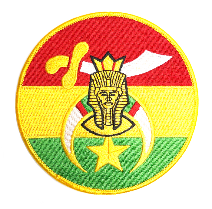Shrine tricolor iron-on emblem. This is a round emblem with a tricolor background of red, yellow, and green. The emblem is fully embroidered with an iron-on back. It measures 6" in diameter.