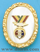 Legion of Honor bolo tie has a round bolo clip with a gold-tone border and mother of pearl background. The LOH logo is in the center of the clip. The bolo tie cord is 36" in length, and white and gold in color.