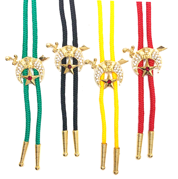 Shrine bolo tie with a variety of cord colors. The Shrine emblem is gold tone and has clear and red rhinestones, it measure 1 1/2". The cords measure 36" and has gold tabs on each end.