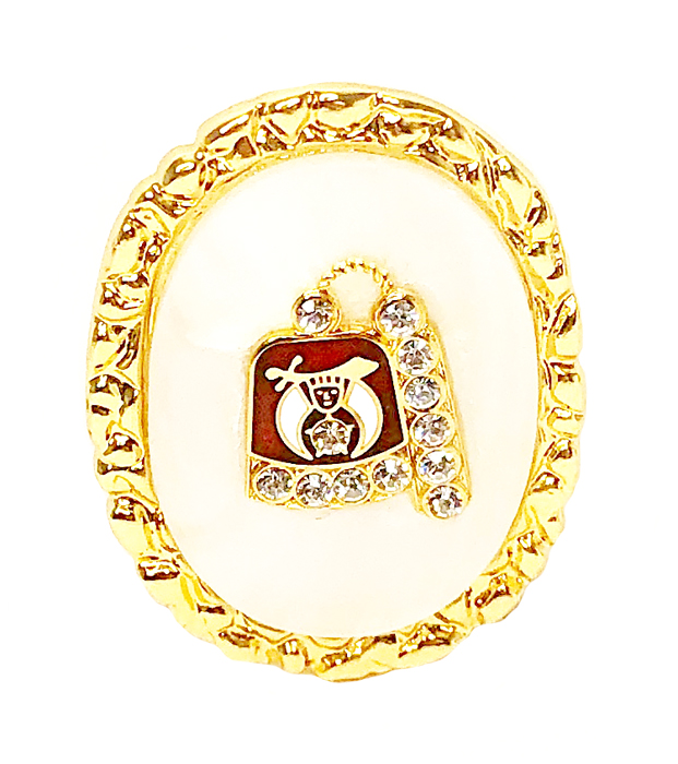 The round bolo clip has a gold-tone border and mother of pearl background. There is a fez in the center of the bolo clip with rhinestones along the tassel and bottom of the fez. The bolo tie cord is 36" in length, and white and gold in color.