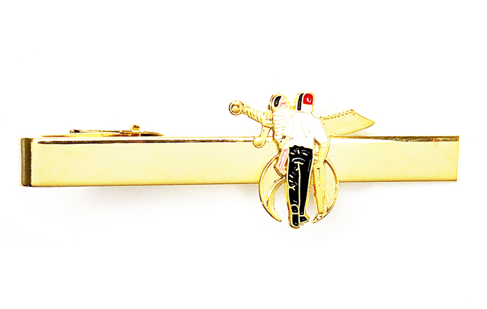 Shrine walking tall tie bar. The tie bar is gold-tone with both the Shrine emblem and the walking tall logo. The Shrine emblem is located directly behind the walking tall on the tie bar. The tie bar measures 2" in length.