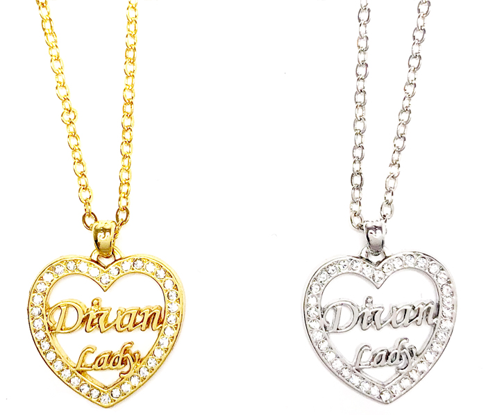 New Divan's Lady Heart Shaped Necklace. This necklace is available in both gold and silver. The heart shaped charm is 1" and is outlined in clear rhinestones. Divan's Lady is in the center of the charm. The necklace is an 18" adjustable chain. It will adjust up to 3" longer.