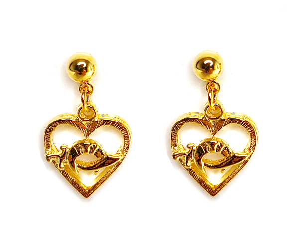 Ladies gold-tone heart shaped earings with shrine emblem. The heart hangs from the top of the earing. Located inside of the heart is a gold-tone shrine emblem. The post backs are made with surgical steel.