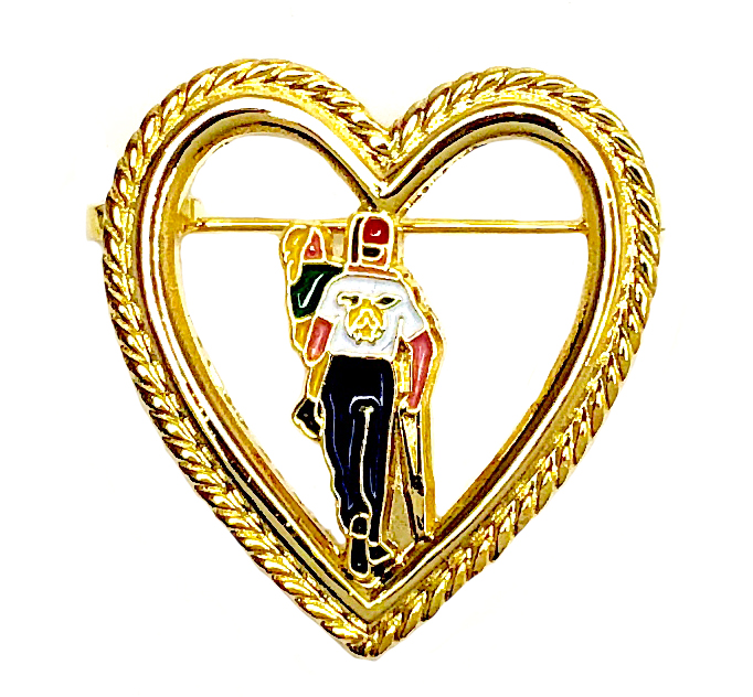 Ladies heart shaped pin with the slient messenger. The man with child is located in the center of the heart. Around the man with child is a gold-tone heart. There is a safety backing for easy wear.