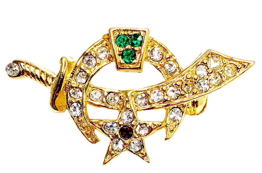 Large rhinestone shrine pin. The pin is gold-tone with various colored rhinestones. Clear rhinestones are located on the sword and crescent with three green rhinestones on the top center of the crescent. The star has clear rhinestones with one red rhinestone in the center. There is a safety back pin for easy wear.