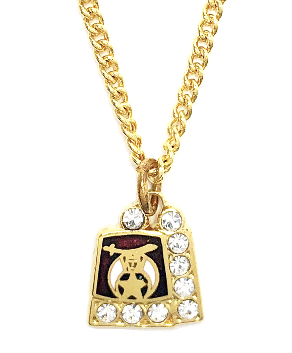 Ladies red fez rhinestone necklace. This necklace is gold-tone and the fez is filled with red enamel. Located in the center of the fez is the shrine emblem. Clear rhinestones follow the bottom of the charm, along the tassel, and one rhinestone is on the top. The gold-tone chain is 18" in length.