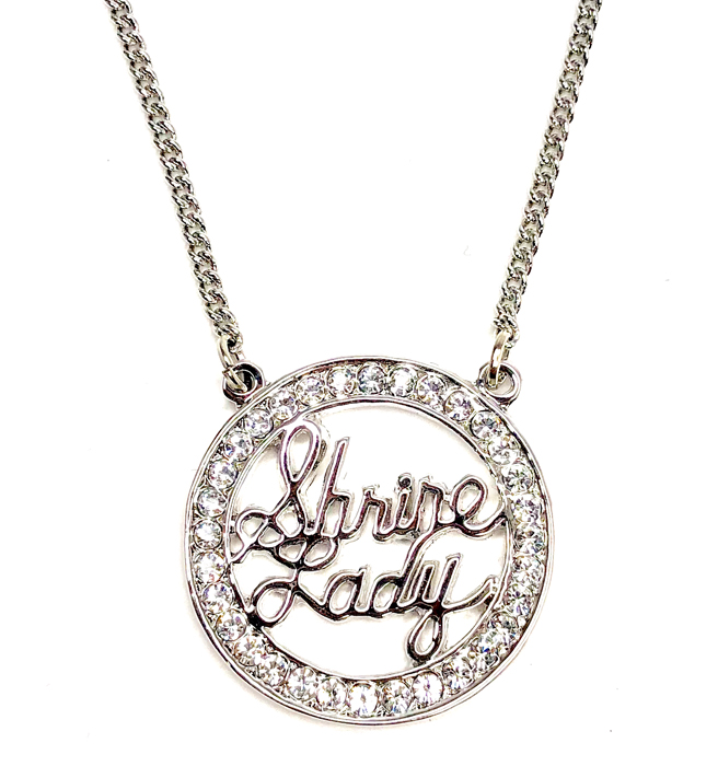Shrine Lady round rhinestone necklace. The silver-tone necklace reads "Shrine Lady" in the center. Around the wording is a silver-tone circle with clear rhinestones. The chain is attached to the charm and measures 18" in length.