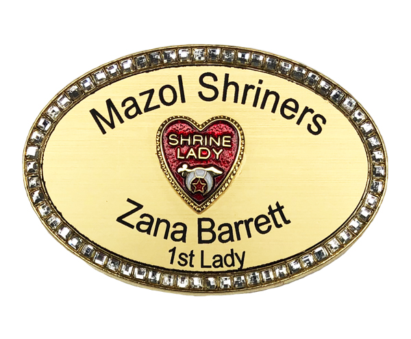 This beautiful gold nametage is encased in an oval of rhinestones. This name tag can hold up to 3 lines of information. The center of the nametag has a metal emblem of the Shrine Lady heart. Please reference the picture for the information you would like on the name tag. The name tag has a magnetic backing, if you need a pin back please let us know.
