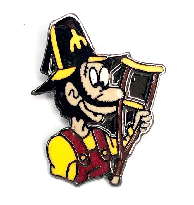 This pin is silver-tone and enamel filled. His hat is silver and yellow, and his crutch is yellow and brown. He is wearing a yellow shirt and red overalls. The pin measure 1".