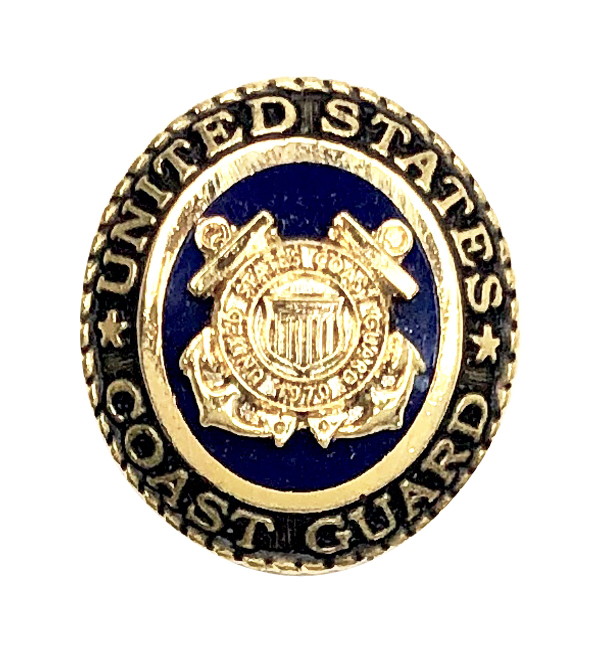 Coast Guard Military Pins. This gold-tone pin has a blue background. The Coast Guard logo is in the center and the wording, United States Coast Guard, goes around the border of the pin.