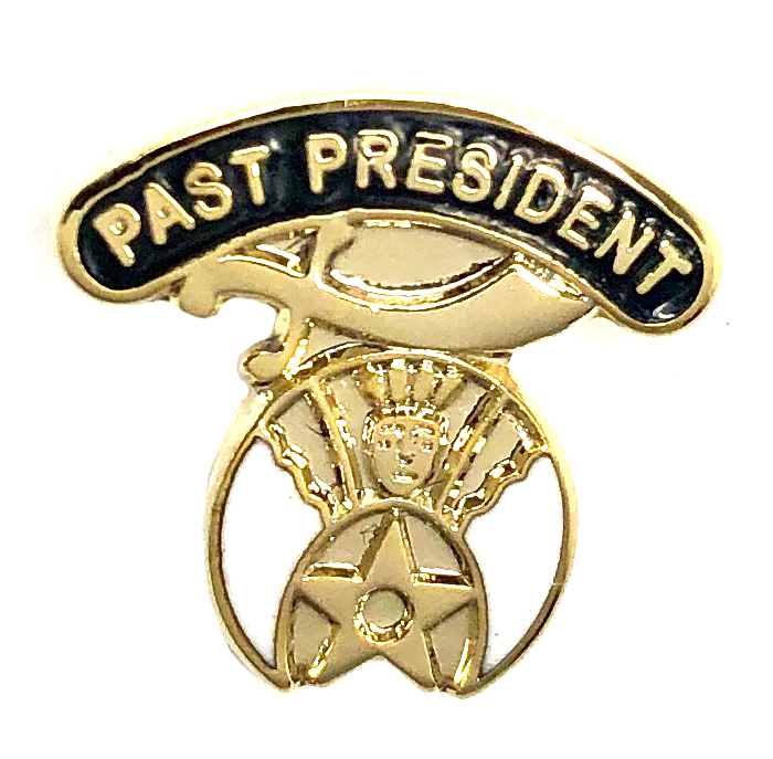 Past President lapel pin. The pin is gold-tone with white enamel in the crescent. Above the sword and crescent is the wording "Past President" with black enamel behind it. This pin measures 1/2".