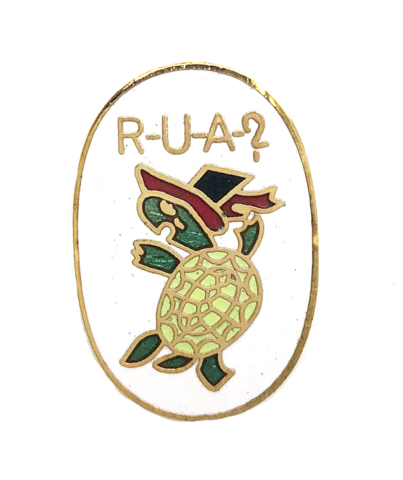 R-U-A Turtle? This gold-tone pin has a white enamel background. The turtle is green and his shell is light green. The letters "R-U-A" is written in gold coloring. The pin is 1" in height.