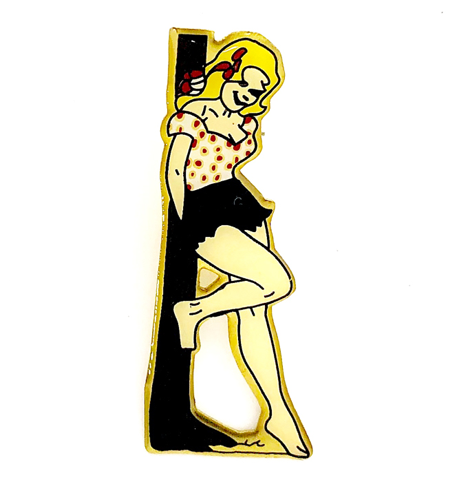 This pin is a leaning Hillbilly Lady, she is reclining up against a tree. The pin is cut to shape. The pin is 2" long and has 2 pin backs.