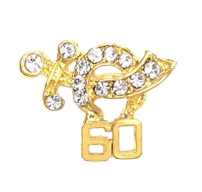 Shrine 60 year pin. This pin is gold-tone with clear rhinestones inlayed in the Shrine emblem. Below the emblem is the number 60. The pin measures 3/4".