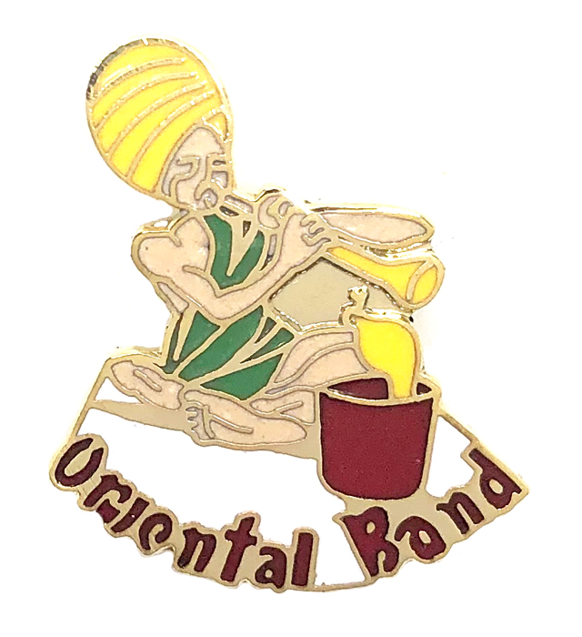 The pin is gold-tone and colored with enamel. The wording, Oriental Band, is written on the bottom of the pin in red. The Oriental Band logo is above the wording. This pin measures 1".