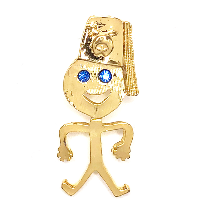 New Shriner stick figure pin. The stick figure is wearing a fez and has blue eyes. The pin is gold color with a single pin back, it measures 1 1/4".