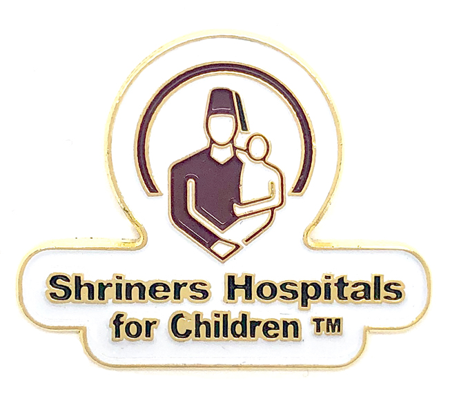 Shriners Hospital Registered Logo Pin. This pin has a white enamel background with the new Shrine Hospital Logo in maroon. Below the logo in black lettering is the wording, Shriners Hospital for Children. This pin measures 1 1/2".