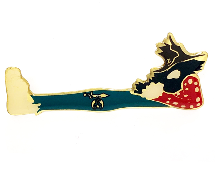 This pin is a laying down Sleeping Hillbilly, cut to shape. On the Sleeping Hillbilly`s leg is the Shrine logo. The pin is 2" long and has 2 pin backs.