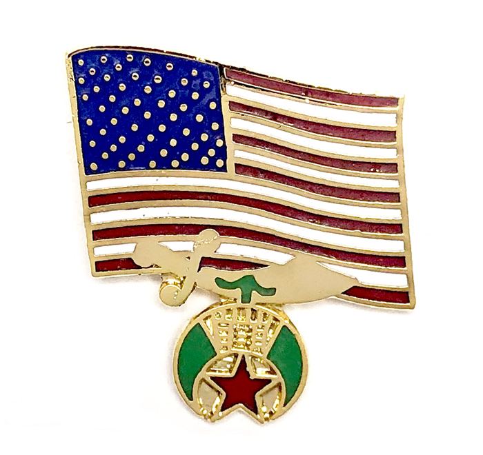 United States Flag with Shrine Emblem. This pin is gold-tone with red, white, and blue colored enamel. Under the flag is the sword and crescent with a red star. The pin is 3/4" in height.
