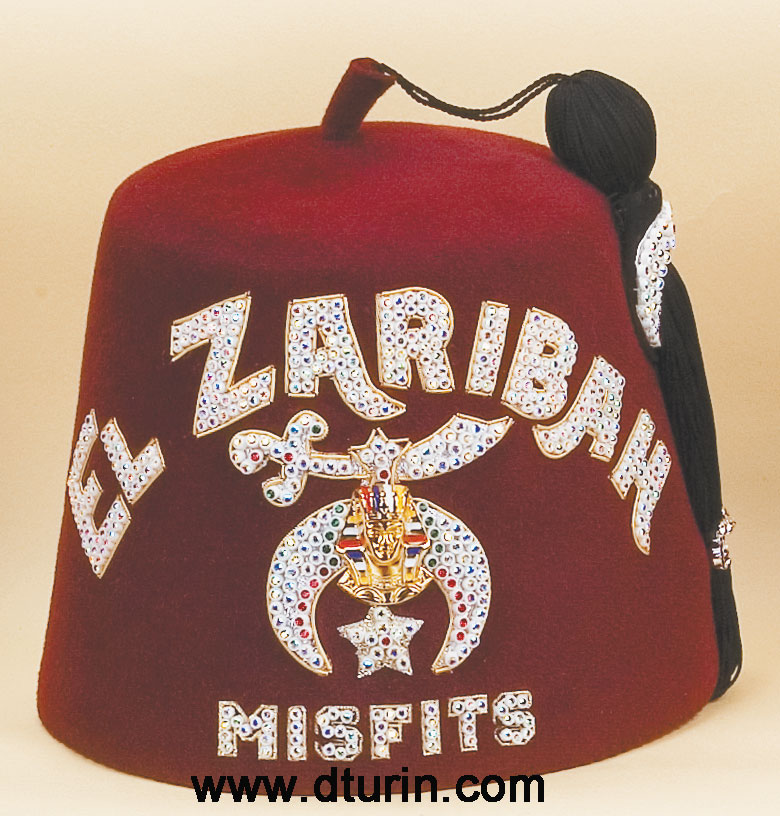 This double row jeweled fez with your temple name comes with an 18" tassel and a tassel holder. The fez body is 100% red wool felt with a ventilated top. This fez comes with a standard Shrine emblem with the sword above the crescent. This fez is available with plastic back or metal back rhinestones. The price includes your Shrine temple name, rhinestone emblem, tassel, and tassel holder.