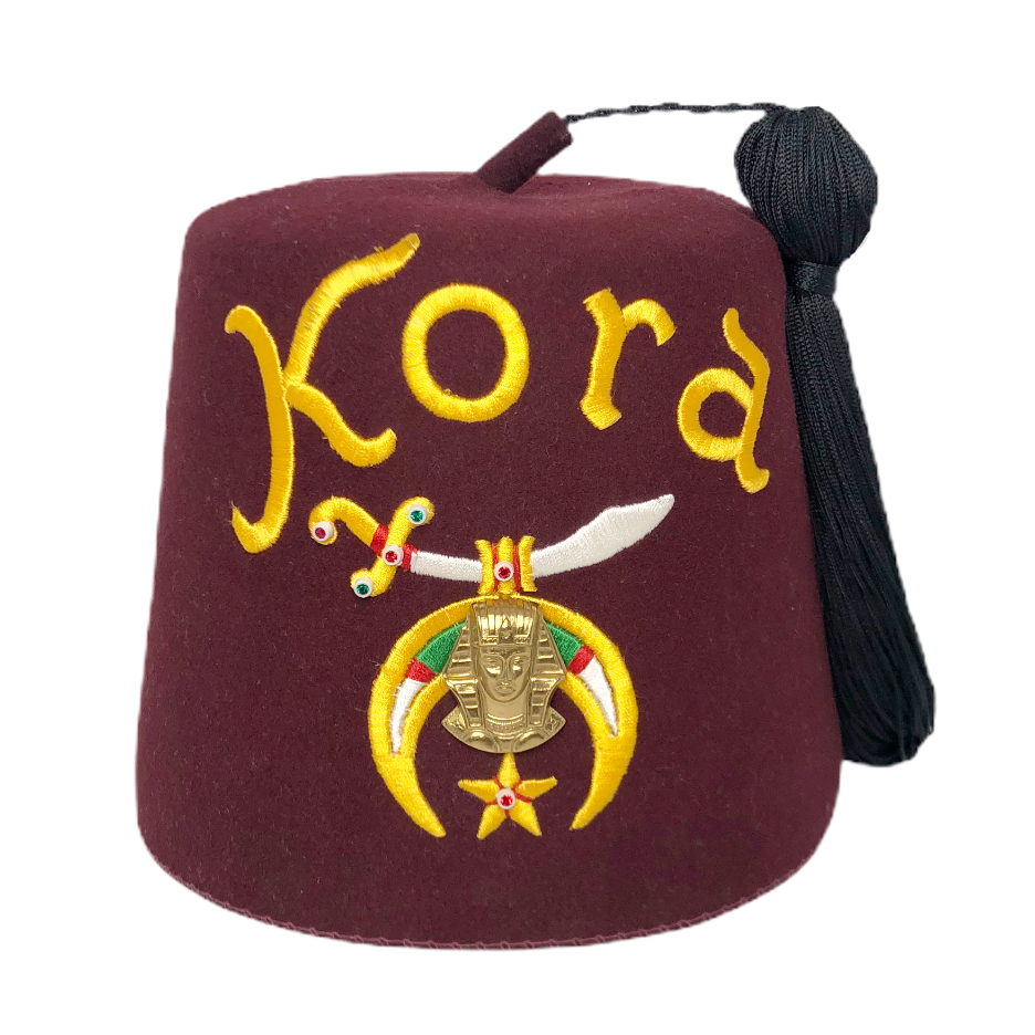 Machine embroidered candidate fez with your temple name in yellow lettering. This fez comes with an 18" tassel stitched down at the top of the fez. The fez body is 100% red wool felt with a ventilated top. The price includes your Shrine temple name, Shrine emblem, and tassel.