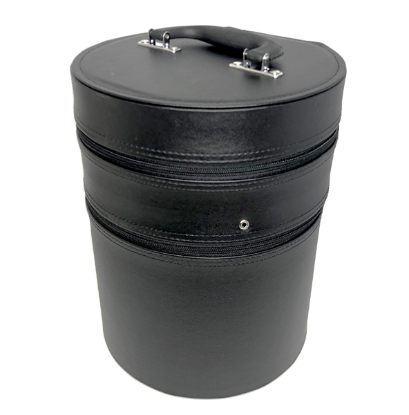 Black double decker fez box with no logo. The top space is designed to hold your Scotttish Rite Cap, and the bottom space is designed to hold your Fez. The box is made out of hard vinyl to protect your fez. This case comes with handle on top for easy travel and an easy open YKK zippers.