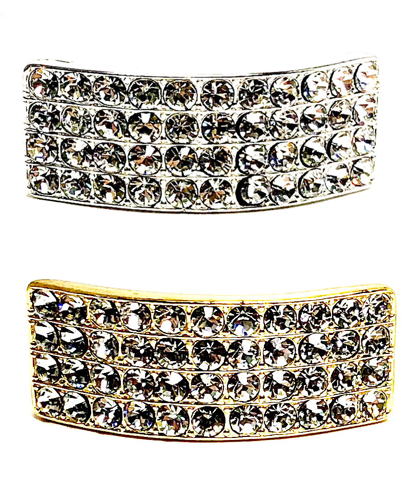 The curved tassel holder has four rows of clear rhinestones. There are two clutch back pins to hold the tassel holder securely to the fez. This tassel holder is available in gold-tone or silver-tone.