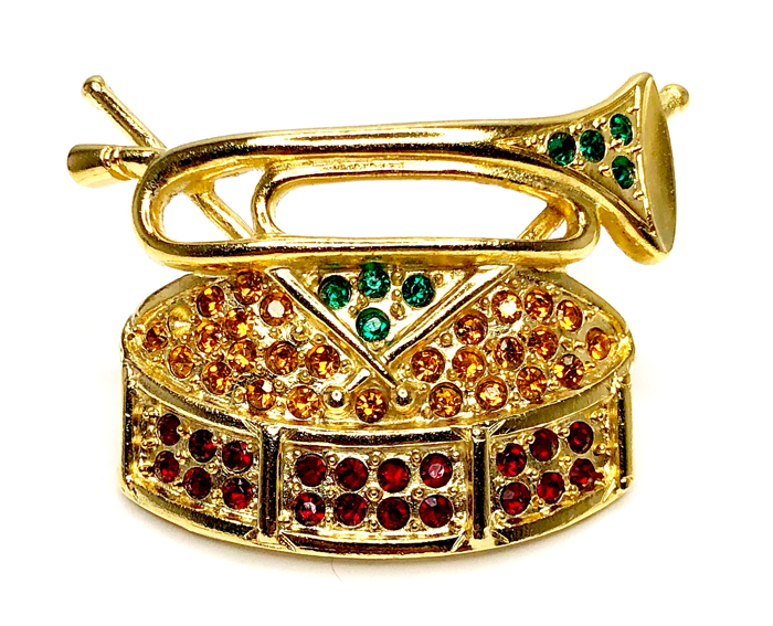 This drum and bugle tassel holder is gold-tone tassel holder has amber, red, and green rhinestones. There are two clutch back pins to secure the tassel holder to a fez.