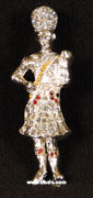 Highlanders drum major tassel holder is silver-tone and has clear, red, and yellow rhinestones. There is two clutch back pins to secure the tassel holder to a fez.