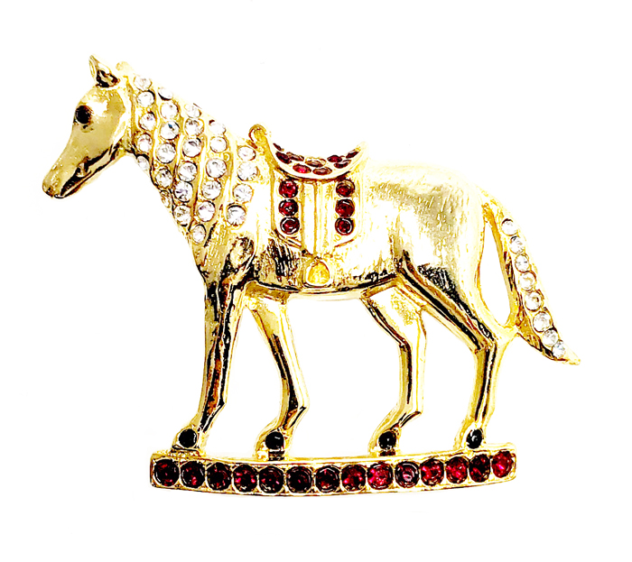 This tassel holder has clear rhinestones on the horse`s mane and tail. Red rhinestones are inlayed on the saddle, horse shoes, and on the bottom of the tassel holder. There are two clutch back pins to secure the tassel holder. This tassel holder is available in gold or silver tone.