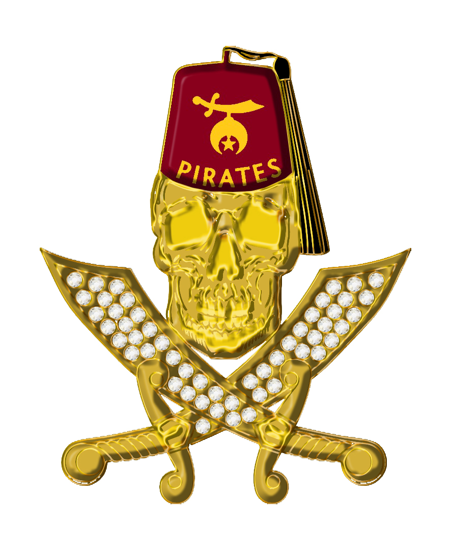 The pirates tassel holder is 2.5" tall, and gold plated with rhinestones. The tassel holder features a skull wearing a red fez with black tassel. The two swords are plated with rhinestones throughout. and the handle is bent to shape. The back of the tassel holder has two pins to securely attach it to your fez.