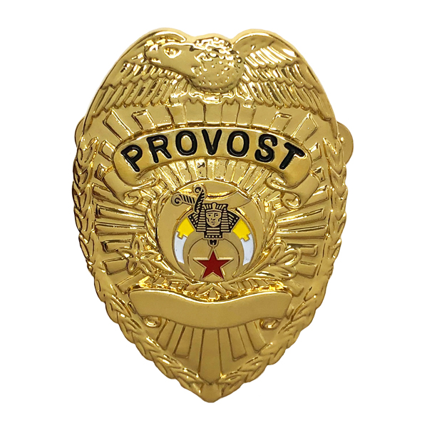 This tassel holder represents the Provost Badge. It is gold -tone, with Provost written across the front and a Shrine emblem in the center. It has 2 clutch pin backs for easy attachment to your fez. The tassel holder measures approx 3" in height and 2" in width.