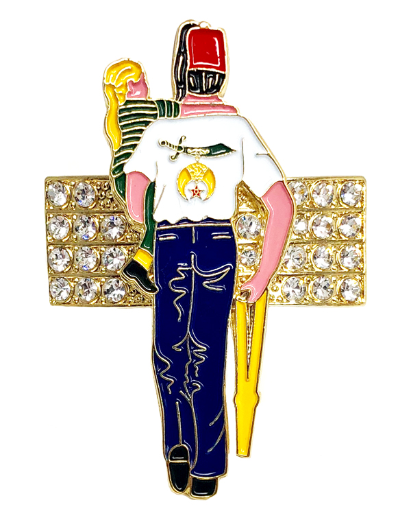The Walking Tall Tassel Holder is a distinguished accessory featuring the iconic Silent Messenger in a gold-tone finish with enamel detailing, facing backward in reverence. Behind the figure, four rows of clear rhinestones add an elegant touch. This tassel holder includes two clutch-back pins for stability.